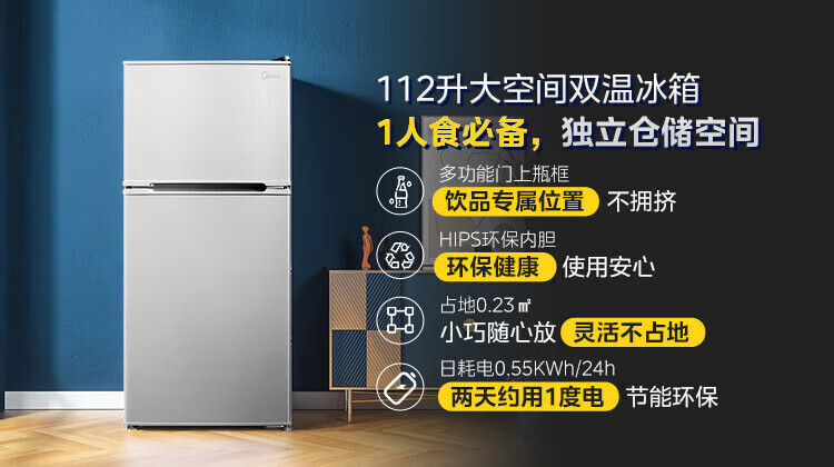 美的(Midea)小冰箱租房用小型双开门112升客厅迷你家用电冰箱BCD-112CM