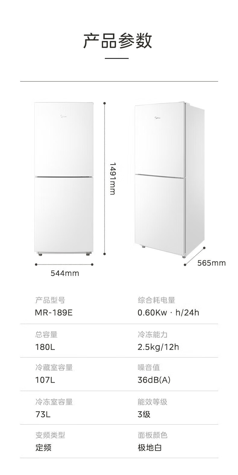 首页 / 家用电器 / 美的(Midea)180升精致白色双开门两门小冰箱租房宿舍低音小型节能家用省电可冷藏冷冻低温补偿深冷速冻MR-189E