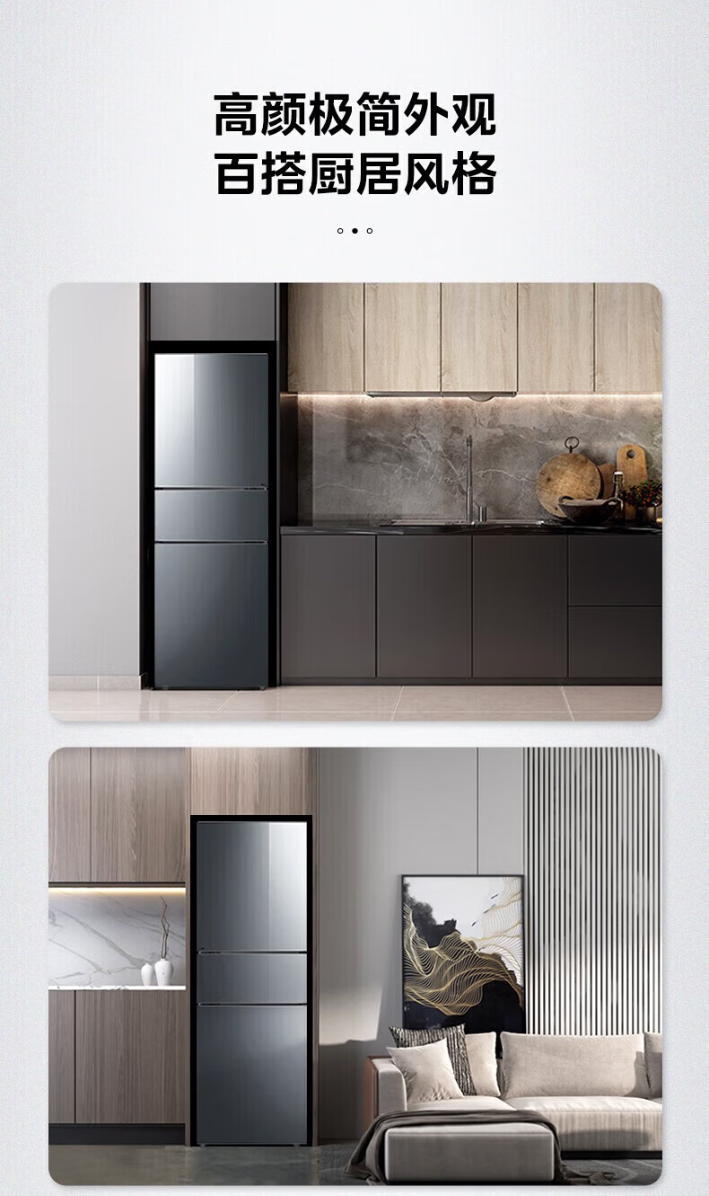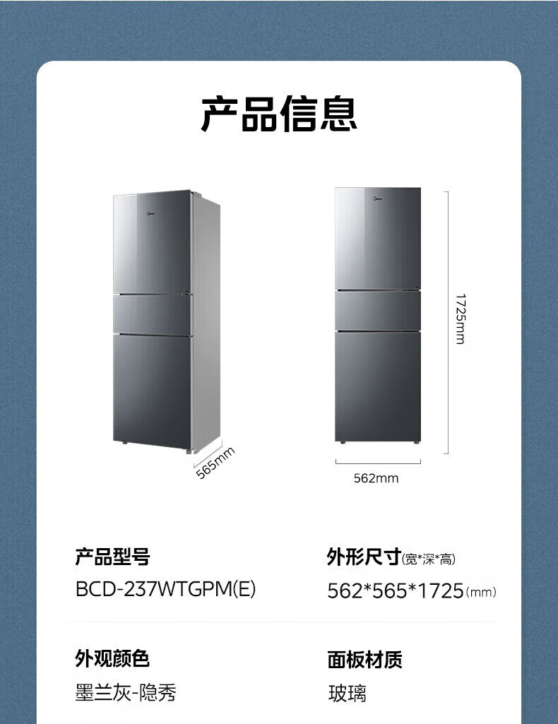 首页 / 家用电器 / 美的(Midea)三开门三门三温小型风冷无霜宽幅变温变频节能省电家用电冰箱236升BCD-236WTM(E)沁玉蓝-星烁
