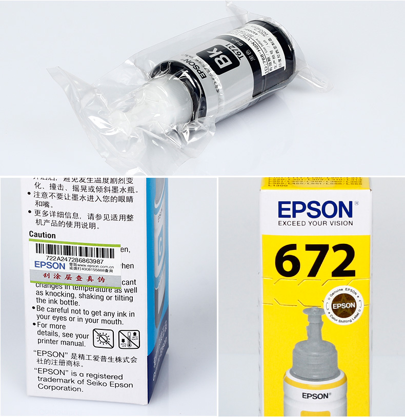 首页 / 电脑办公 / 爱普生(EPSON)原装墨水L664L110打印机672墨水L120L200L210L100L110墨盒四色墨水套装-收货领15红包
