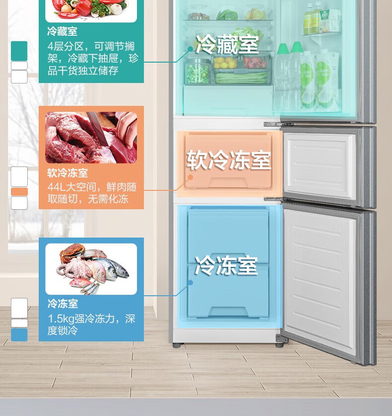 美的(Midea)215升电冰箱三门三温超薄小户型租房家用宿舍节能保鲜省电低音软冷冻三开门小冰箱BCD-215TM