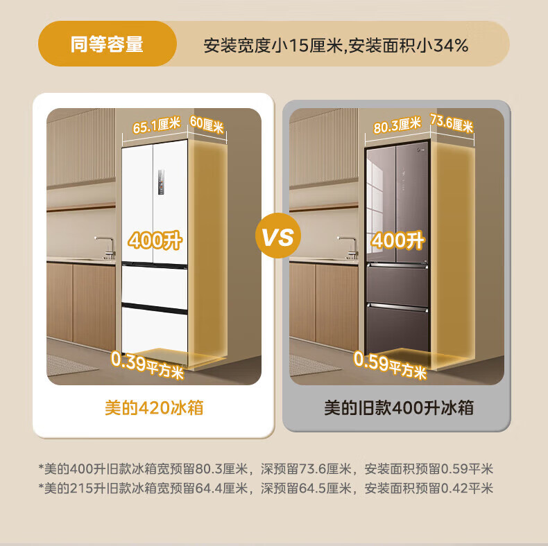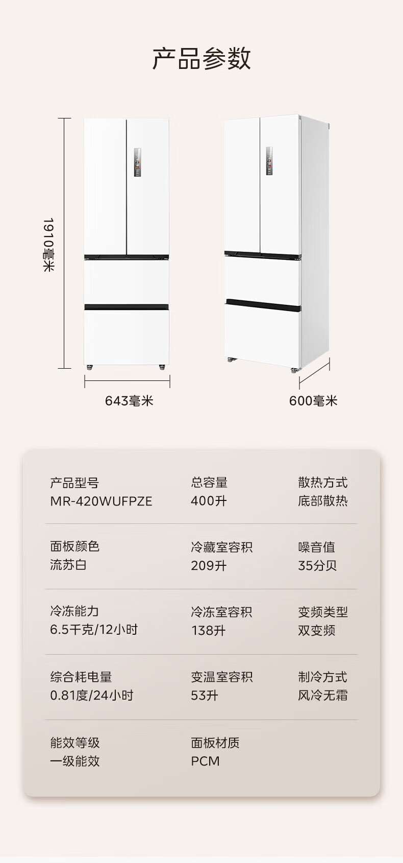 美的(Midea)冰箱法式四门法式400升大容量60cm薄嵌入式底部散热PT净味抗菌一级能效手机联网家用电冰箱白色