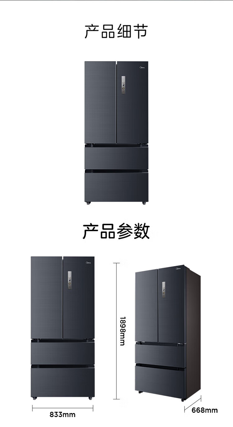 首页 / 家用电器 / 美的(Midea)508升冰箱19分钟急速净味法式四开门双系统双循环多门大容量BCD-508WTPZM(E)莫兰灰