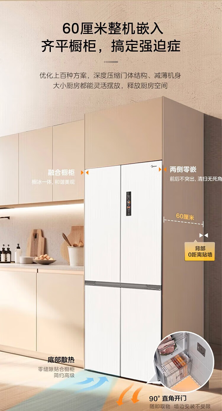 首页 / 家用电器 / 美的(Midea)60cm薄无缝全嵌系列十字对开门四开门多门嵌入风冷大容量一级双变频智能底部散热电冰箱大容量【23年新上市】MR-457WUSPZE白色