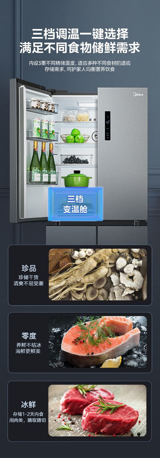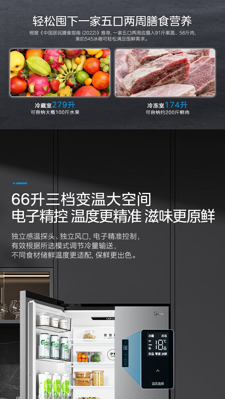 首页 / 家用电器 / 美的(Midea)十字对开门四门风冷无霜一级能效双变频双循环超薄净味家用电冰箱513升双循环BCD-513WTPZM(E)